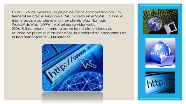 1986. La NSF comenzó el desarrollo de NSFNET que se convirtió en la principal Red en árbol de Internet, complementada después con las redes NSINET y ESNET, todas ellas en Estados Unidos. 1989. Con la integración de los protocolos OSI en la arquitectura de Internet, se inició la tendencia actual de permitir no sólo la interconexión de redes de estructuras dispares, sino también la de facilitar el uso de distintos protocolos de comunicaciones. En el CERN de Ginebra, un grupo de físicos encabezado por Tim Berners-Lee creó el lenguaje HTML, basado en el SGML. En 1990 el mismo equipo construyó el primer cliente Web, llamado WorldWideWeb (WWW), y el primer servidor web. 2006. El 3 de enero, Internet alcanzó los mil cien millones de usuarios. Se prevé que en diez años, la cantidad de navegantes de la Red aumentará a 2.000 millones.